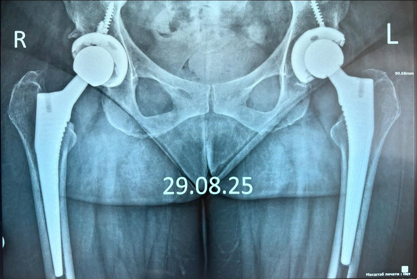 На фото видим удачный пример полной замены (двустороннего эндопротезирования) тазобедренного сустава.Что сказать – если через 2 месяца после операции пациент приходит на приём, при этом не имеет жалоб и на вопрос о целях посещения и беспокоит ли что-то, отвечает – всё хорошо, вы сами сказали прийти через 2 месяца на осмотр, значит работа выполнена 100% так, как нужно.И это очень приятно.